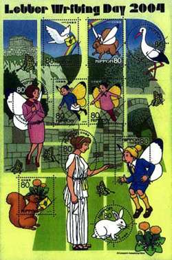 私はふみの日切手は20年前のように葉書用額面切手1種類、封書用額面切手1種類、デザインの素敵な切手を出す方がいいです。ほんと、ふるさと切手の方がまだまともなデザインで出している感じがしています。郵政民営化の話が出てますけど、切手のデザインは民間に委託した方がまだいいかもしれませんね。(2004.6.12提供) |