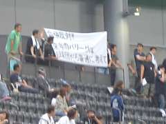 7回表・千葉ロッテの攻撃の前、ライト側の千葉ロッテファンが「合併反対!!来年のパ・リーグは6球団だろ普通に考えて」という横断幕を掲げていました。