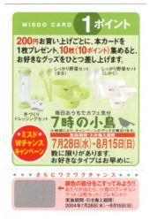 ●東日本キャンペーンのミスドカードをGET ミスタードーナツ(ミスド)は7月28日(水)から8月15(日)まで、キャンペーン実施中ですが、北海道&西日本と北海道を除く東日本で違うキャンペーンとなっており、昨日(8月5日)、青森古川ショップで北海道以外の東日本バージョンのミスドカードをGETしました(北海道&西日本バージョン→日記録・2004年7月28日)。(2004.9.28提供)