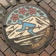 帯広市はスズランです。なお、帯広市の花はクロユリです。新得町はスキーとエゾヤマザクラ(新得町花)です。新得町のスキーといえば、サホロリゾートスキー場ですね。なお、新得町のカラーマンホールは新得駅前にありました。(2004.9.4提供)