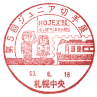 第6回北海道ジュニア切手展 1989(平成元)年6月17日〜20日 札幌中央局○ 〒060 札幌市東区 北海道地図、北海道百年記念塔、手をつなぐ男の子を女の子、「HOJEX’89」の文字 (yua第3作(20歳)) |