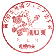 第7回北海道ジュニア切手展 1990(平成2)年6月16日〜18日 札幌中央局○ 〒060 札幌市東区 サッカーボールを蹴っている切手のクマ、シンボルマーク (シンボルマーク:北海道地図、「HOJEX’90」の文字) (yua第4作(21歳)) |