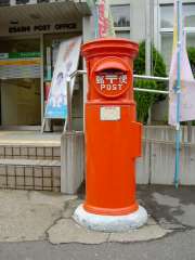 いにしえ街道沿いにある江差郵便局の局前に丸形ポストがあります。郵便物の取出口はポストの右側です。(2002.6.18提供) |