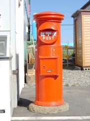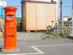 JR浜小清水駅/道の駅「はなやか(葉菜野花)小清水」横)の横(西側)にある、マートフレトイ前に丸形ポストが設置されています。浜小清水駅の列車の中からも丸形ポストをちらっと確認することができます(一番下の写真が浜小清水駅ホーム(網走方面)から見た丸形ポスト)。(2002.9.25提供) |