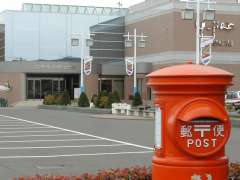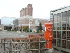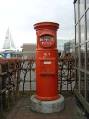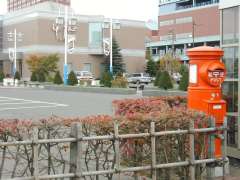 石原裕次郎記念館前に丸型ポストがあります。丸形ポスト後ろの高い建物はウィングベイ小樽のヒルトン小樽、横手にある建物はポスフール小樽店、真横は公衆電話です。(2004.10.25提供) |