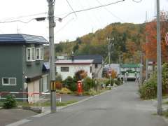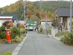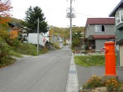 米川宅前(旧米川商店前)に丸形ポストがあります。このあたりは高台にあり、ポストの位置も坂にある状態です。ここまで来るのにも斜度20度の勾配を上っていく道を進んで、やっと到着しました(^^;。となりに住んでいる方がベランダから「このポストは今まで3度、テレビに紹介されたことがあるんだよ」と教えてくれました。(2004.10.25提供) |