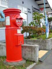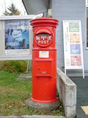 札幌簾舞郵便局前に丸形ポストが設置されています。札幌市内で唯一、局前に丸形ポストのある郵便局です(簡易局を除く)。(2002.10.26提供) |