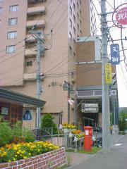 「定山渓観光協会前」とありますが、すぐ後ろの建物は公衆トイレです(^^;。観光協会は建物の西側(左側)にある白い建物です。東側(右側)にある大きな建物は定山渓万世閣ホテルミリオーネです。 |