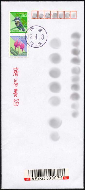 消印は新しいものが使われ(予備用または、有珠山噴火に伴い急遽づくられたものと思われる)、簡易書留バーコードラベルの番号も、臨時郵便局用に1巻分まるごと用意されたため、最初の引受は「498−33−50001−0」(知人あてに差し出したもの)でした。(2001.3.22提供)