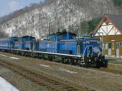 8:33 余市駅到着。大阪発札幌行の寝台特急トワイライトエクスプレスとすれ違う。