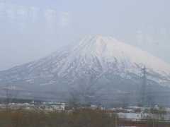 途中の倶知安付近で、蝦夷富士こと羊蹄山がすごくきれいでした。列車の窓ガラス越しにデジカメで撮る。