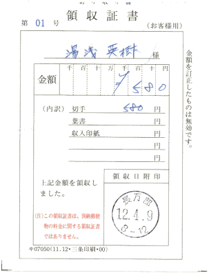 12:15 切手を購入する。用意している切手が10、50、80、100、200円だったので、配達記録(290円)を出すため、200、80、10円の切手を購入する(各2枚)。領収証をお願いしたら、ちゃんと出してもらう。