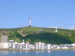 | 6:33 | あっという間に稚内が遠くに。丘にそびえるのは、中央左側の塔が稚内局風景印にも描かれている稚内開基百年記念塔、右側は稚内公園の風車です。 |