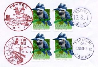| 9:01 | 千歳ヤマセミ局到着。「ヤマセミ」シール切手、そして、今までの「ヤマセミ」切手シリーズ( 通常、コイル、シール、国際切手展シール(ファミリーペーンはパス…単に手持ちがない(^^;)))を使って、千歳ヤマセミ局の和文印、欧文印、風景印を押す(あとでヤマセミの風景印を使用している千歳春日局に行って、風景印を押印)。 ロビーにあるテーブルの上に北海道はもとより、北海道以外を含むふるさと切手のみほんがあり、販売中とのことで、昨年発売の東京版の花切手(5種連刷)と富山版のチューリップ切手(2種変則連刷)を買う。10:01局を出る。 |