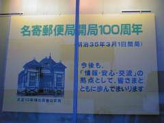 | 19:20 | やーっと、記念押印終了(^^;。本当は19時閉局ですが、押印が19時を過ぎることを断って、ずっと押し続ける。ま、名寄局はゆうゆう窓口営業時間を含めれば「24時間営業」で、局自体の営業はずっとやっているので、閉局後も問題なく押すことができ、よかったです。 なお、郵便局ロビーにて「日本100年記念切手展」などの展示を行っていました。日本で発売されたいろんな100周年記念切手のリーフです。こういうテーマで集められた作品、私は非常に好きですね(^^)。 |