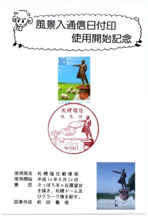 札幌福住郵便局に到着。Oさんはこれから所用のため、忘れ物を受け取り、局を出る。ここまでクルマで3局を回っていただき、本当にありがとうございます。 局では新風景印使用を記念した台紙を作成。旧風景印最終印と新風景印初日印押しのものは1部160円で販売中でしたが、切手が貼られていない状態の台紙を1枚もらうことができたので、羊ヶ丘展望台切手に新風景印を記念押印する。 |