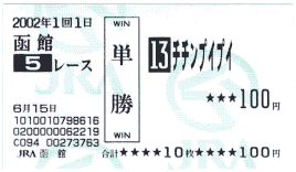 | 9:05 | 入場券(100円)を買い、函館競馬場に入場する。そして、入口すぐにある「函館競馬場臨時郵便局」(函館東郵便局)で、函館競馬場オリジナルふみカード(千円券2枚セット・2千円)を買う。レース写真は昨年の第68回日本ダービー(右:優勝馬・ジャングルポケット号、左:2着馬・ダンツフレーム号)です。カードには「第68回日本ダービー」と入っていますが、優勝馬がのちにジャパンカップを制し、年度代表馬となるジャングルポケット号…という宣伝は一切していません。「ジャングルポケット号のふみカードはいかがですか」と宣伝すれば、すぐ売れるのに…。 そのあと、小型印を押印。雨ではないものの、細かい細かい霧雨状態だったので、万全を喫して傘を差しながらの押印。 |