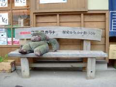 そのあと、江差町3つ目の丸形ポスト、関川商店前に向かい、無事発見。江差町の丸形ポスト3つはすべて「いにしえ街道」沿いにあります。いにしえ街道沿いは道路拡張工事、そして建物を昔風にリフォームしているのが目立ちました。 で、デジカメ撮影しようとしたら、観光客が丸形ポストを見て、ポストといっしょに記念撮影していました(^^)。デジカメ撮影のあと、商店に入って缶コーヒーを買い、レシートをしっかりもらう。商店前には「コアップガラナ」の広告入りベンチにゴリラ(と思う)ぬいぐるみが座っていました。このあと函館に戻る。 |