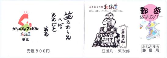 | 15:32 | 道の駅・江差に到着。道の駅スタンプを押す。スタンプでは「道の駅 江差・繁次郎浜」となっていました。そして、江差尾山局の風景印に描かれている「江差の繁次郎」像をデジカメ撮影する。道の駅には「ゆうペーン」ならぬ「郵遊切手カバー」なる切手帳があり、エゾクロテン切手10枚入り・800円で売られていました。 |