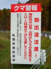 | 10:25 | 2.5kmほど進んだところで、道道1号線(朝里峠経由・小樽方面行)と道道95号・京極定山渓線(と言っても、定山渓からは豊羽鉱山で行き止まってしまう。それでも、れっきとした主要道道!)との分岐点があり(看板・左上)、豊羽に向けて道を曲がる。これから先は歩道は一切ありません(^^;。 豊羽への分岐のところには「熊出没注意!」という看板がありました(看板・右)。気をつけねば(^^;。豊羽方面から道道1号線方面に向かう看板(左下)は「温泉」が「定山渓」、「ダム」が「定山溪」となぜか「渓」「溪」と字が異なってます。 |