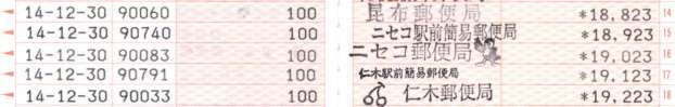 | 10:52 | ニセコ駅前簡易郵便局に到着。いかにも北海道の簡易郵便局という風景ですね(^^;。100円貯金、50円定額小為替発行、和文印、和文ローラー印を記念押印する。和文印は局名部分の活字がかなりほこりがたまっていて、D欄「北海道」の文字もほとんど読みとれない状態。時間に余裕があるので、千枚通しを使って、10分近く消印のお掃除。局名部分は開局印みたいにきれいな状態にしました(^^)。11:08・局を出る。 |
