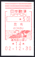 | 10:08 | やっと昆布郵便局に入る。局舎の局名表示と入口がかなり離れているため、局の入口にもご丁寧に「昆布郵便局」のプレートがありました。 100円貯金、50円定額小為替購入、風景印、和文印の記念押印、50円メータースタンプ購入による私製葉書差し出しをする。 |