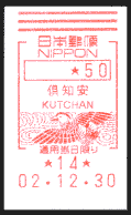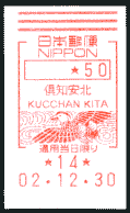 | 13:44 | 倶知安北局到着。風景印、欧文印の記念押印、50円メータースタンプ購入による私製葉書差し出しをする。メータースタンプの欧文局名表示が「KUCCHANKITA」と倶知安南局同様、「KU」の次が「T」でなく「C」になってました。13:51・局を出る。 |