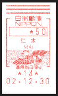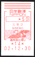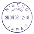 | 11:17 | ニセコ郵便局に到着。100円貯金と50円定額小為替を購入。100円貯金の際、局名のゴム印に鳥が入っていたので、局員さんに「この鳥は何ですか?」と尋ねたところ、アカゲラとのことでした(あとで調べたところ、ニセコ町の町鳥がアカゲラでした)。そのあと、時間に余裕があったので、元日用の記念押印などをする。12時になってから、やっと和文印(インク浸透式印、金属印(つち型))、和文ローラー印、欧文印、和文機械印(押印機)を記念押印、50円メータースタンプ購入による私製葉書差し出しをする。あと、ふるさと切手北海道版で販売している切手のみほんがあったのですが、その中に北海道ではほとんど売り切れ状態の「北の島に咲く花」(2001.6.22発行)があり、2シート購入する。12:08・局を出る。 |