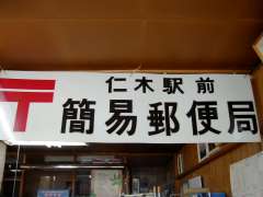 | 14:50 | 仁木駅前簡易局到着。100円貯金と50円定額小為替を購入、和文印、和文ローラー印の記念押印をする。前に貯金をしたニセコ局で主務者印押し忘れがあったことが発覚。ニセコ局ではアカゲラのゴム印に目がいってしまい、主務者印押印の確認を全くしてませんでした(^^;。デジカメ用電池がほんとにあと1枚撮れるかどうかの状態で、局内の天井から下げられていた局の看板(きっと、昔は外に掲げられていたものでしょう)を了解を得て撮影する。なんとか大丈夫でした(^^)。14:57・局を出る。 |