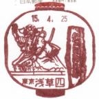 4月25日(金)から27日(日)まで浅草で開催の「スタンプショウ’03」で毎年恒例なのが「風景印めぐり」。東京都内の郵便局で使用している風景印のうち、数局がスタンプショウ会場で押すことができるもの。昨年までは離島や奥多摩地域のが押せて、めったに行けない局の風景印が押せたのは非常に嬉しかったのですが、今年は会場周辺の郵便局6局ということになりました。それも、局の風景印が1本しかなく、今日は郵便局営業日で持っていくことが不可能なため、押印サービスは26日と27日の2日のみで、25日は押せません。と、いうことで、いっそのこと、25日に実際の局に行って押印してみようということで、浅草局以外の6局へ本当の「局廻り」をしてきました」(^^;。 (1)台東花川戸局(13:36)→(2)台東聖天前局(13:50)→(3)東浅草局(14:02)→(4)台東千束局(14:12)→(5)浅草四局(14:22)→(いったんスタンプショウ会場に戻る)→(6)雷門局(14:44) |
