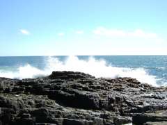 | 11:10 | おおむね西・南方向に進んだのですが、ずっと強い向かい風(^^;。そして、やっとの思いで根室十景「花咲灯台と車石」に到着。まずは花咲灯台を撮影。そのあと、車石のある方向に整備されている階段を下りていく途中、海岸線の景色はほんとにすごい崖で、強い波で削られて今の状態になっているんですよね。いよいよ「車石」の下に到着。見上げると直径7.5mの「車石」!自然のアートですよね(^^)。車石の見える位置から後ろ向きになり、海の方を見ると、強く高い波が崖に当たって、すごい水しぶき。見ている位置まではしぶきは飛んでこないものの、水しぶきは高いので3m以上と、ちょっとこわかったです(^^;。 |