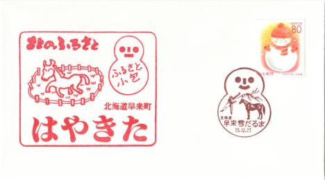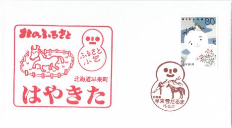 | 15:40 | 年賀印押印が終わり、早来駅のスタンプ押し封筒に雪だるま切手(ふるさと切手、グリーティング切手)に早来雪だるま局風景印を押す。なお、普通のインクジェット用はがきは売り切れ。インクジェット用年賀葉書が売り切れていて、普通のを買い求める客が多くての売り切れですね(^^;。 |