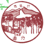 | 16:38 | 追分駅から約300m離れている追分局に行き、風景印を押印する。局名の字体が使用開始(1979年(昭和54年)9月1日)のときと異なっていました。切手自販機そばにあるレンガ風の近代的な壁には木の扉の私書箱6つ…すごくミスマッチですね(^^;。 |