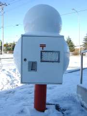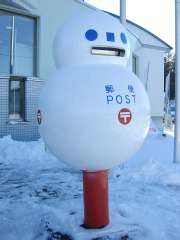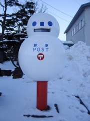 | 14:09 | 局に入る前、雪だるま形のポストを撮影する。写真の上段は左から向かって正面、右、背面、下段は向かって左前方からの撮影です。 |