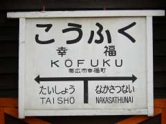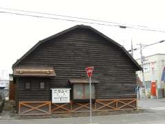 | 9:34 | 富良野局のそばに旧国鉄広尾線・幸福駅の駅名標がある家?があり、デジカメ撮影する(建物の右手後ろが富良野局)。どういう建物かは全く調べてません(^^;。 |