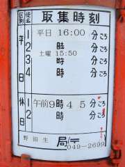 山越郵便局前に丸形ポストが設置されています。山越局は国道5号線沿いにあります。丸ポストは朱色に塗り替えられているものの、「郵〒便 POST」は白文字にしてませんでした(^^;。 |