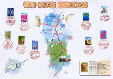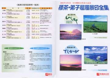 標茶郵便局(川上郡標茶町)では4月1日に日本郵政公社設立を記念した「標茶・弟子屈風景印全集」のたとうを制作し、通信販売をしています。なお、このたとうに収録されている風景印は標茶町、弟子屈町にある郵便局全9局(簡易局を除く)で使われているもので、押印日付は平成15年4月1日です。うち5局(標茶局(標茶町)、弟子屈局、美留和局、屈斜路局、川湯局(以上、弟子屈町)の5局は新風景印初日印(4月1日に図案改正)です。 |