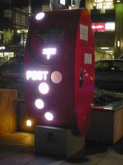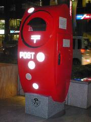 http://www.japanpost.jp/pressrelease/s01/200104/010402a.html ポストの全面に白の発光オブジェを配したデザインで、夜間にはオブジェが発光し、容易にポストの位置確認できます。土台の石には「ポストンくん」が描かれています。