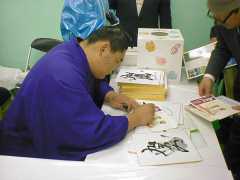 洪水に見舞われているモンゴルへの募金した方に、旭鷲山関の手形入りのサインがもらうことができました。また、旭鷲山関のモンゴル切手にスタンプショウ用のスタンプを押したカバーにサインをしてもらうこともできました。